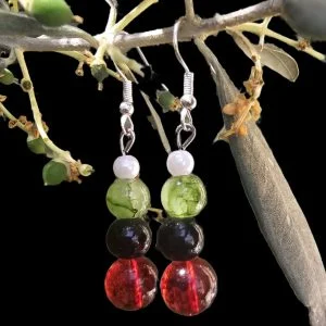 Each handmade glass bead, represents a color of the flag, and its meaning: red for sacrifice, black for mourning, green for the olive trees, and white for the purity of the land.