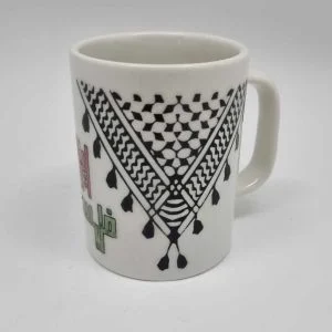 A one-of-a-kind hand made mug, meticulously handcrafted, and adorned with a traditional Palestinian motif. Perfect for adding a unique touch to your home.