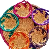 This colorful woven wheat straw plate/small, was droned with the “Ruler’s Staircase” design and natural dye colors.