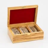 Combining wood, mosaic stone, and traditional embroidery, the piece showcases a unique fusion of textures and materials. Each box is skillfully crafted by a Palestinian student artisan, reflecting creativity, heritage, and fine craftsmanship.