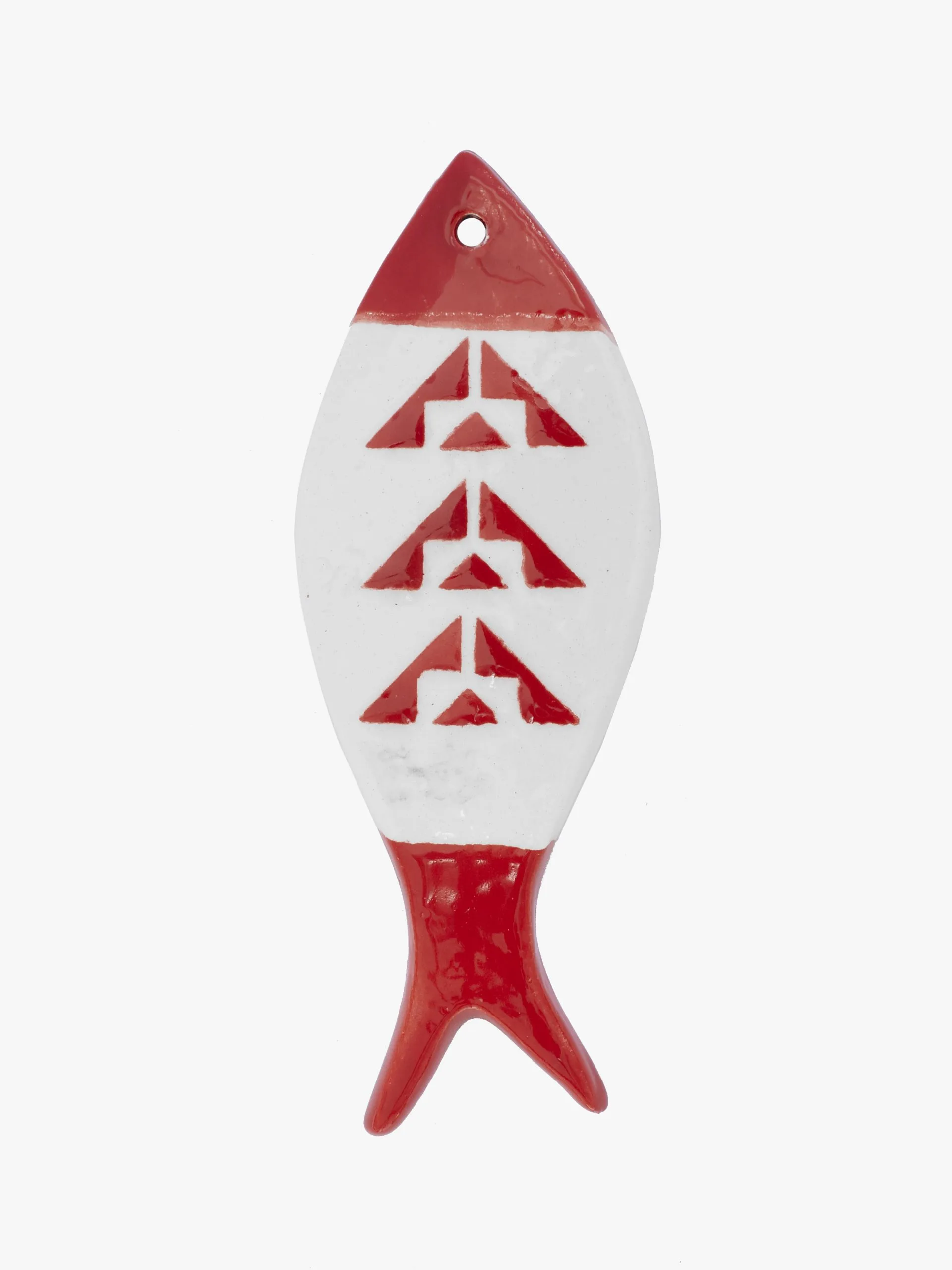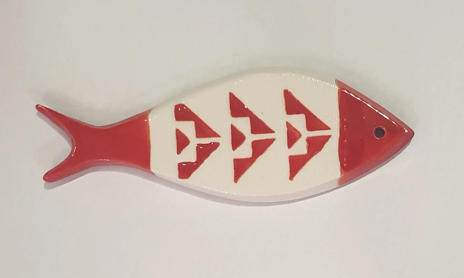 handmade red and white ceramic fish ornament with a Palestinian embroidery drawings