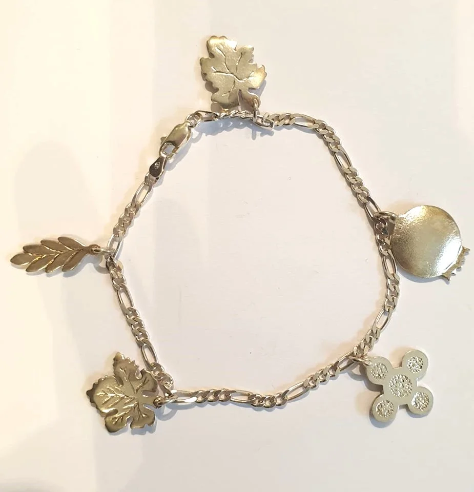 The bracelet features a beautifully balanced design, incorporating symbols of faith and abundance: a pomegranate, cross, grape leaf, and wheat, each representing tradition, spirituality, and prosperity.