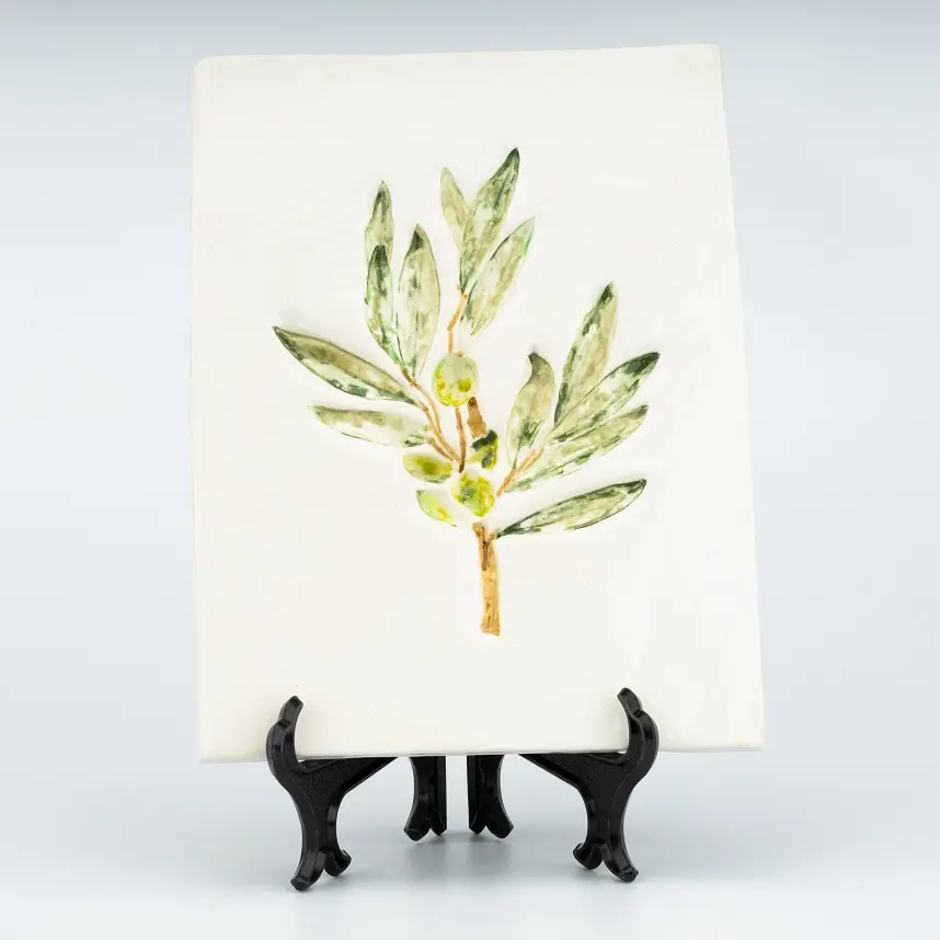 This handmade ceramic Display Plate Olive Branch Stamp, crafted from locally sourced Palestinian mud.