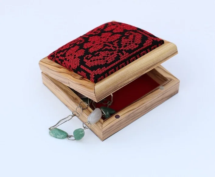 Experience the artistry of Bethlehem, with this exquisite Olive Wood Palestinian Embroidery box.
