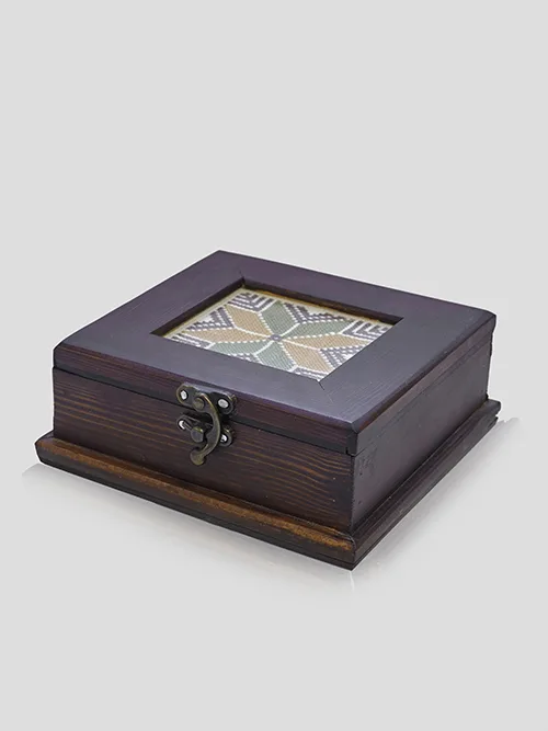 The student combine three materials together which are: Palestinian mosaic stones and wood and Palestinian embroidery.