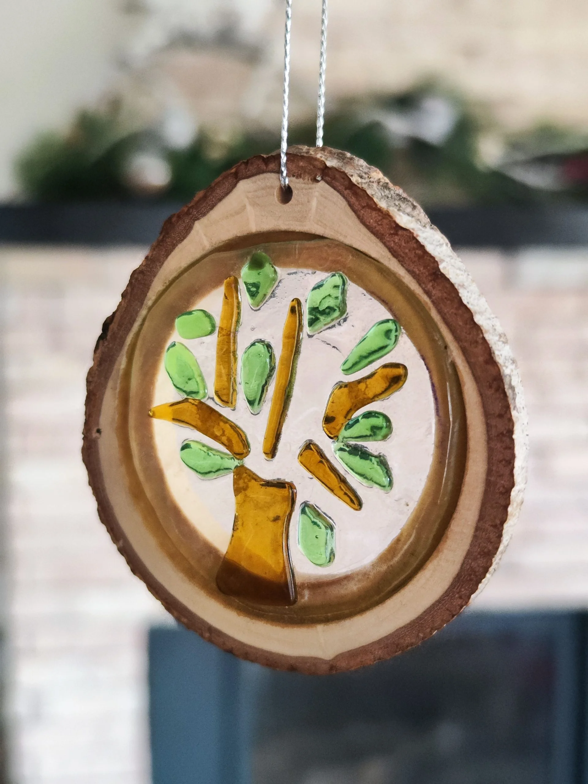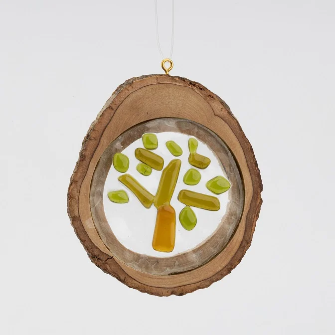 This fused glass olive tree ornament, framed with natural olive wood, is designed and handcrafted by a skilled Bethlehem artisan. Perfectly blending traditional Palestinian craftsmanship with modern artistry, it celebrates the beauty, heritage, and culture of Palestine.