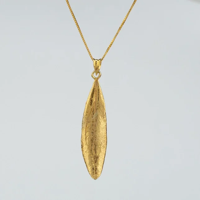 Handcrafted in Bethlehem, this Gold-Plated Olive Leaf Pendant begins with a real olive leaf, each one unique and full of natural beauty. The leaves are carefully cast in gypsum, burnt out in the furnace, and reborn in molten silver, preserving every delicate vein and detail.