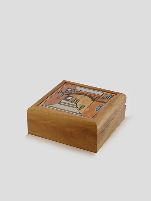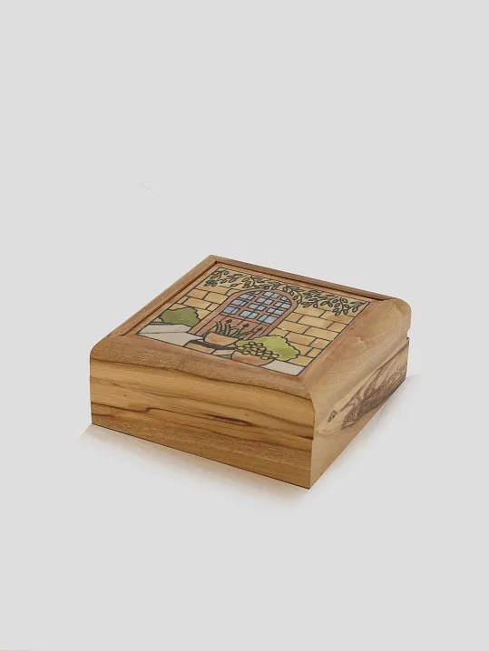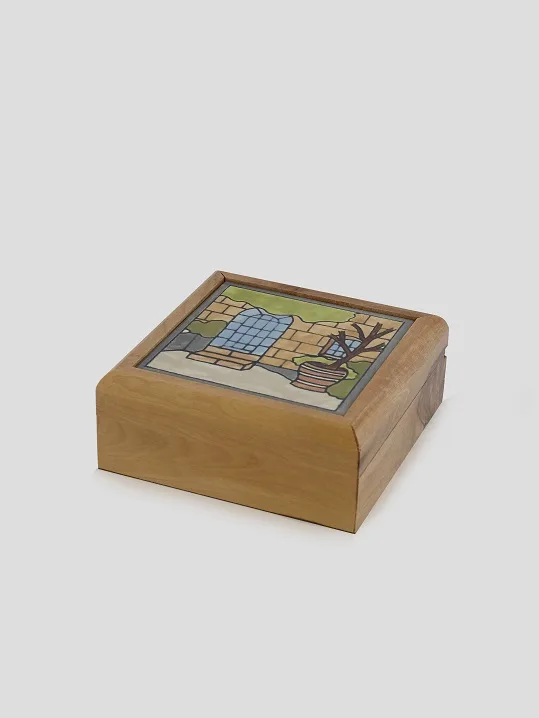 This olive wood box, is adorned with a hand-painted ceramic tile.