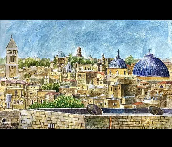 Old City of Jerusalem: Where history, and holiness, meet in watercolor. More straightforward and emphasizes the meeting of history and religion.