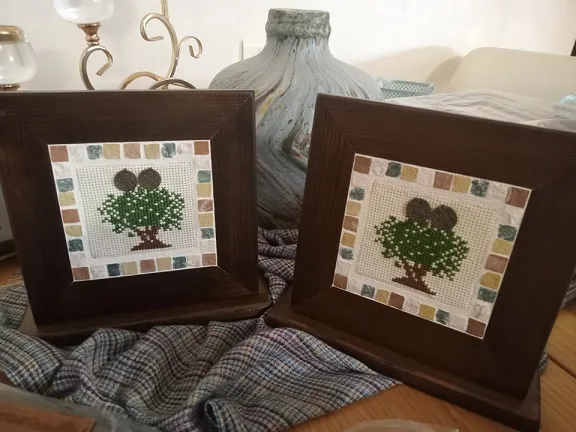 wood hand made stand with olive tree embroidery and one stone row, decorated with two Palestinian coins.