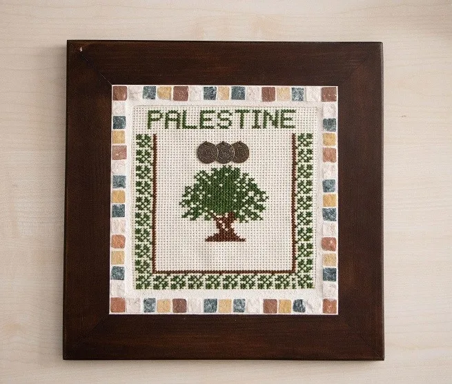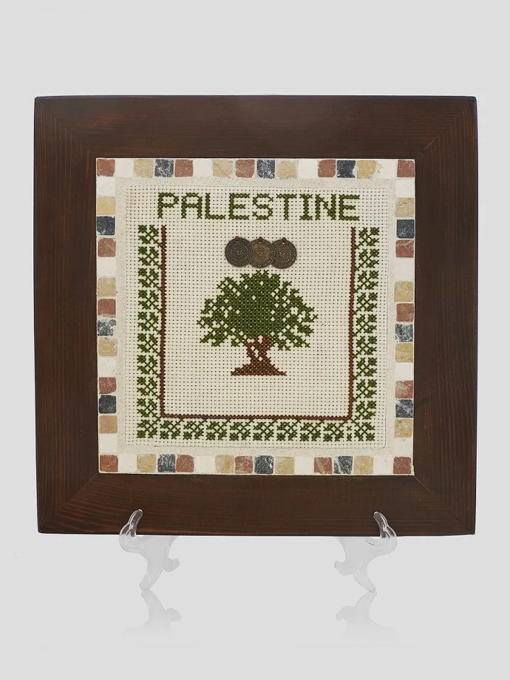 It features a stunning piece of Palestinian embroidery from Bethlehem.