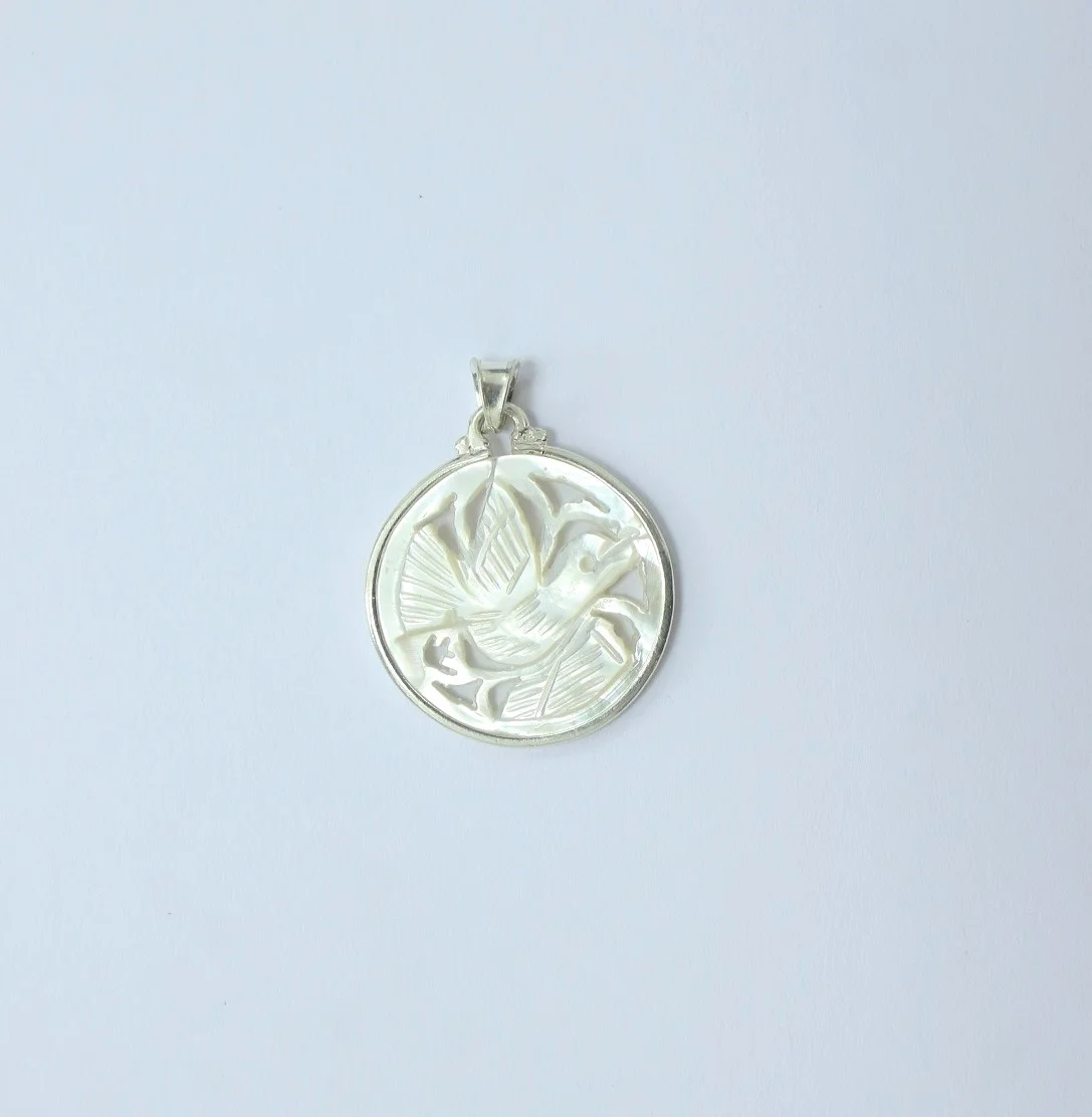 Handcrafted through the collaboration of two skilled artisans, this piece combines traditional craftsmanship with meaningful design. The delicate mother-of-pearl dove is gracefully framed with sterling silver, enhancing its beauty while creating a refined and balanced look.