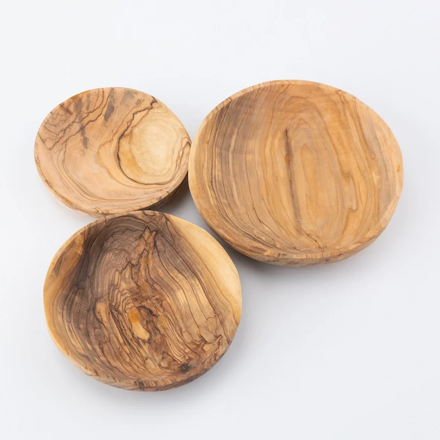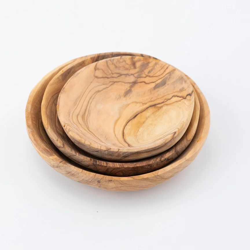 Enjoy your meal with this Hand made, natural round olive wood plate set, from Bethlehem.